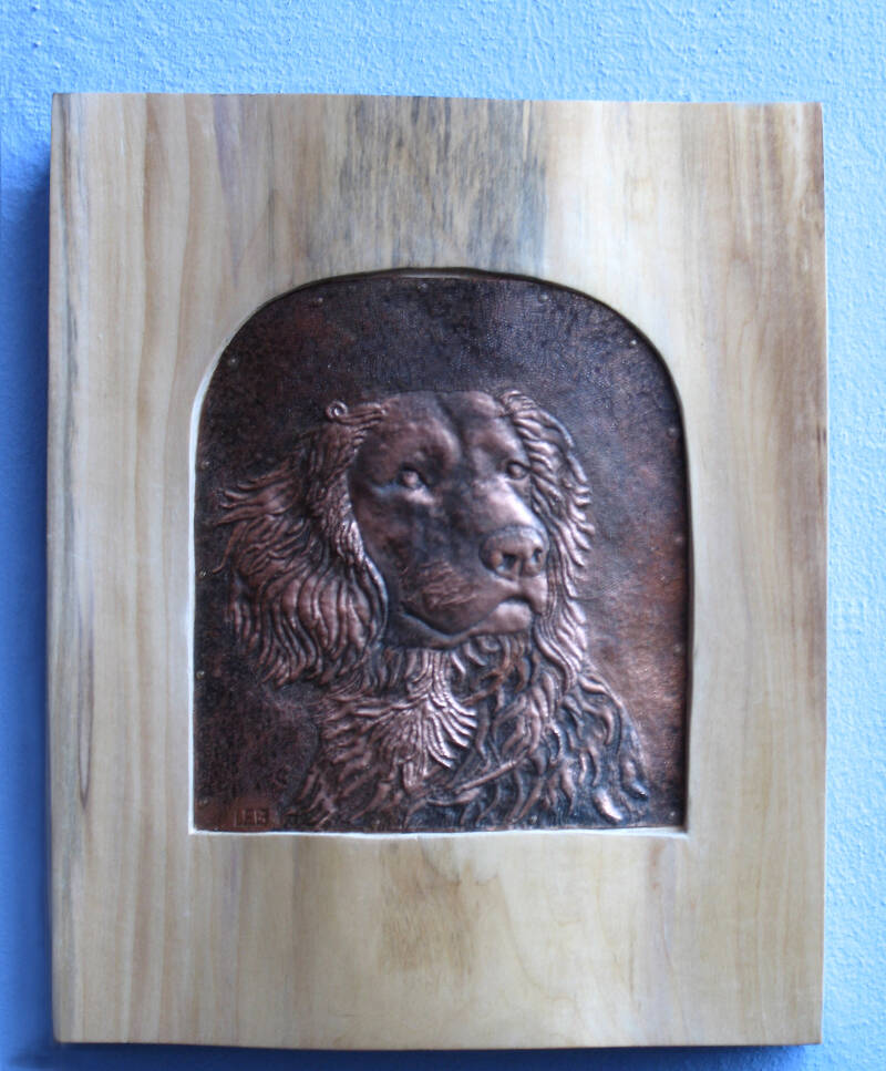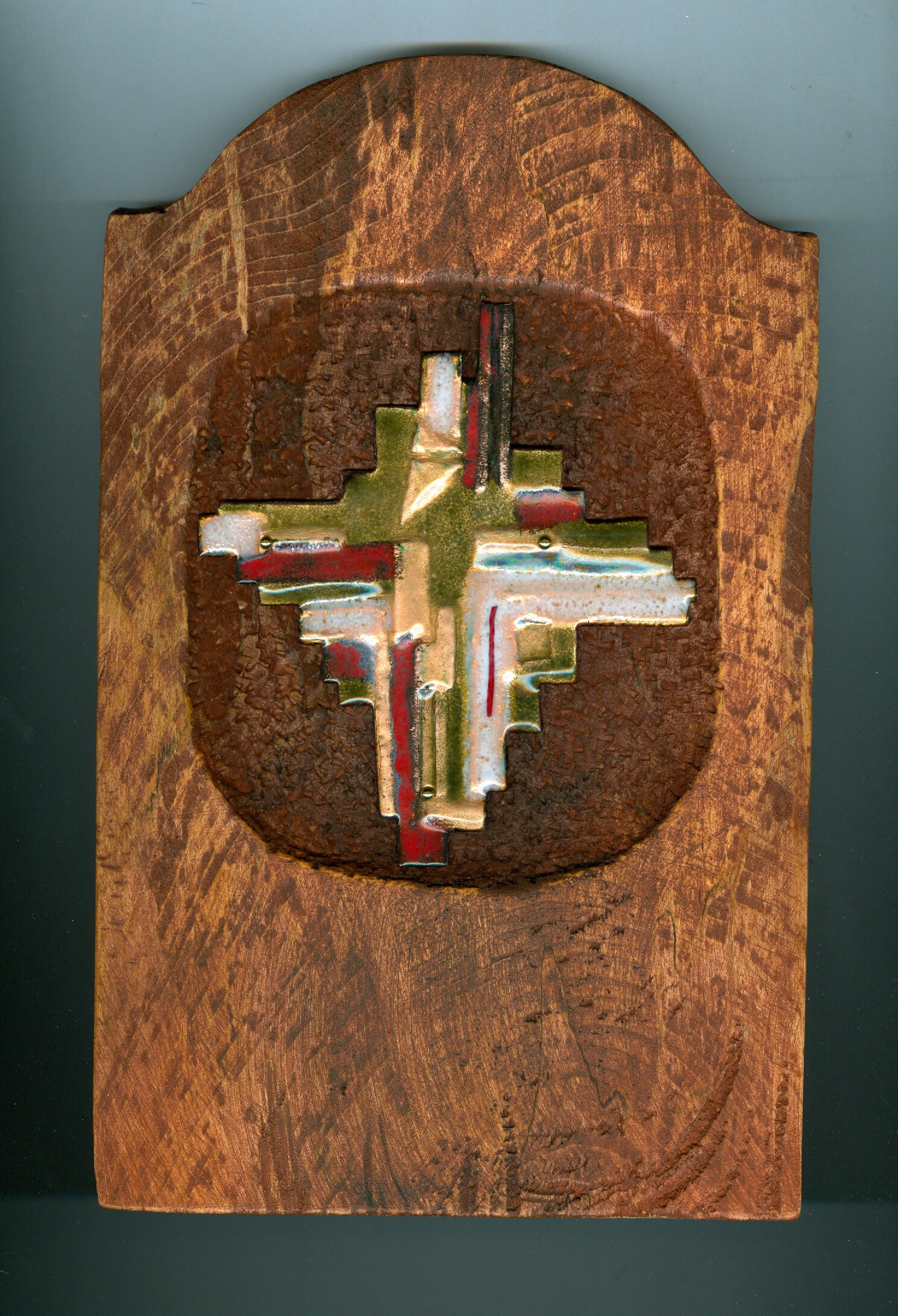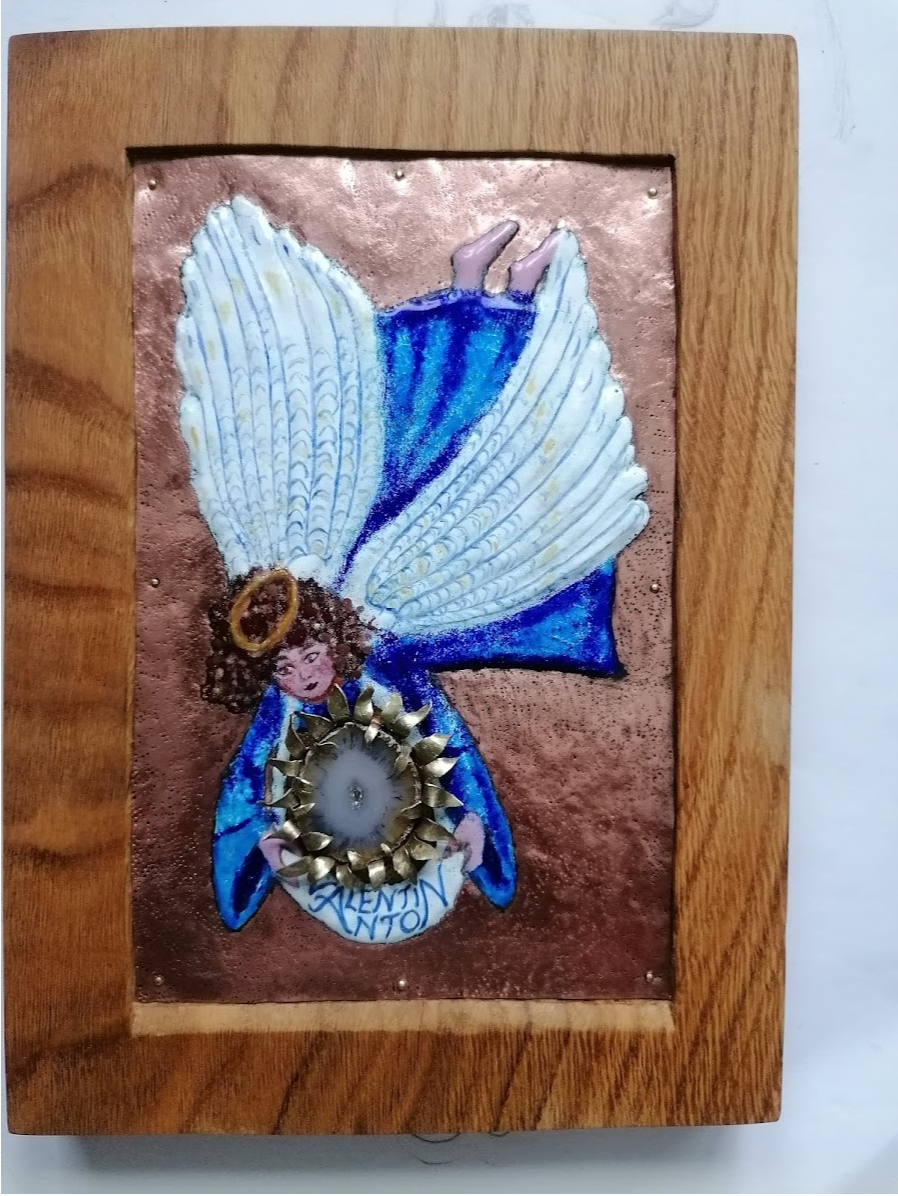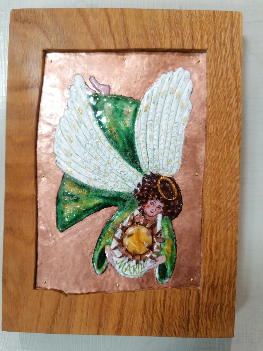 Kupfer getrieben, emailliert Gold unterlegt, auf Holz gearbeitet mit Bernstein; Kupfer in der Größe von ca 12x18 cm