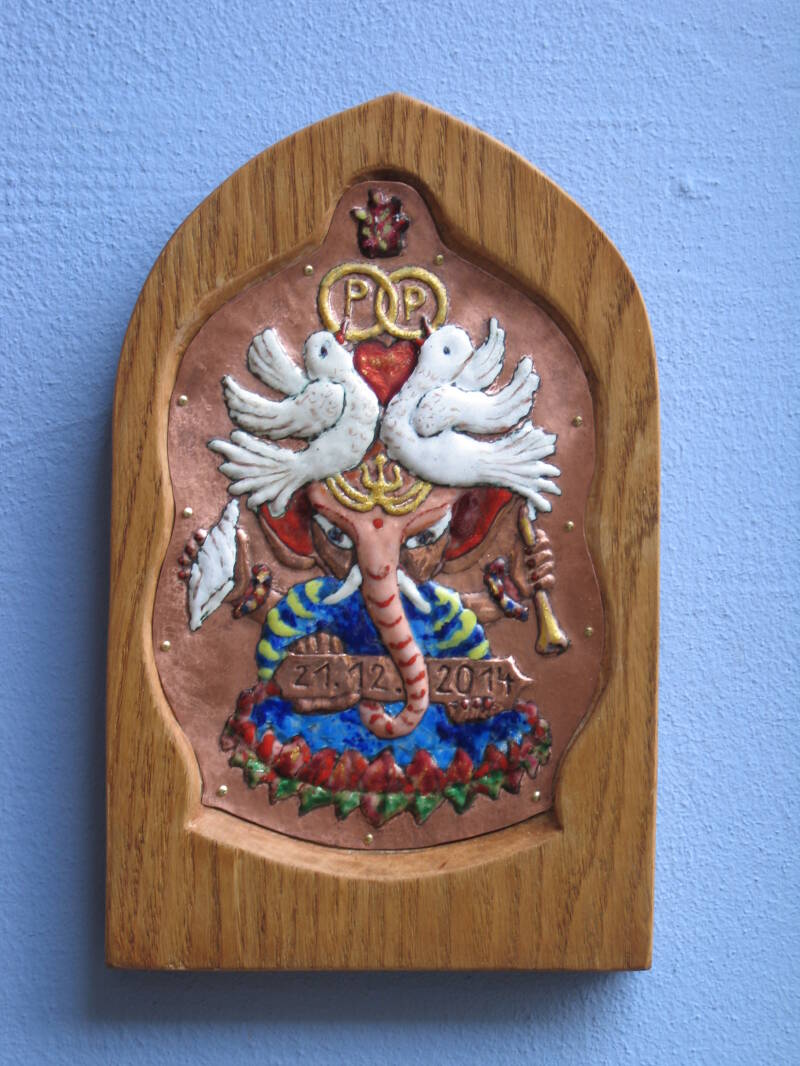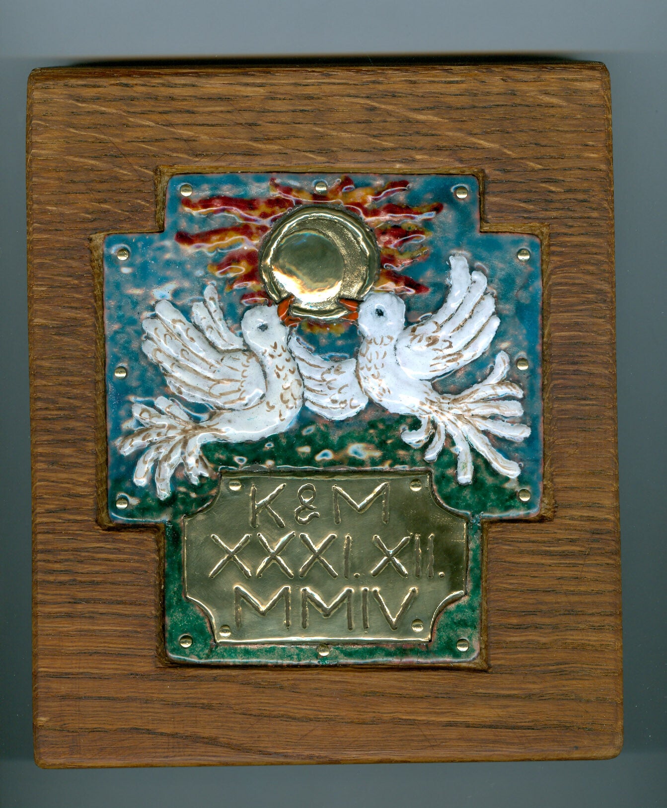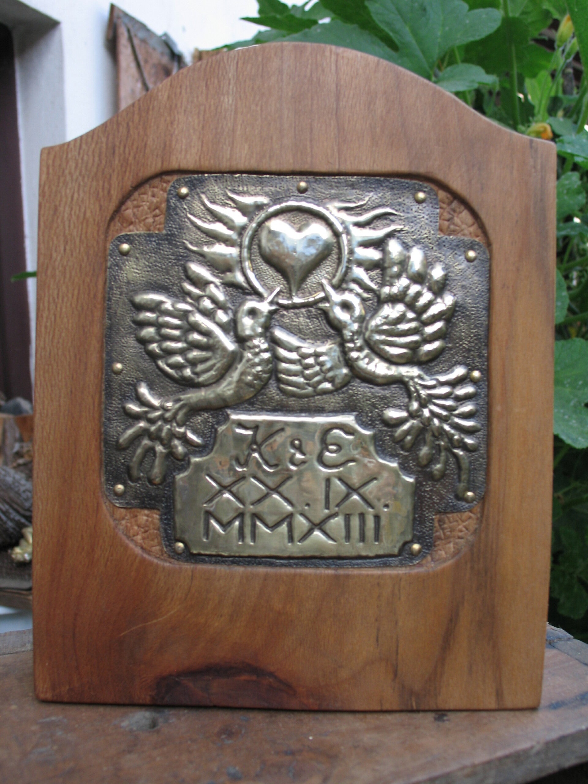 Hochzeit Kombination von Kupfer ca 13x10cm getrieben, emailliert und Sonne und Schrifttafel in Messing getrieben auf Holz ca 20x15cm gearbeitet